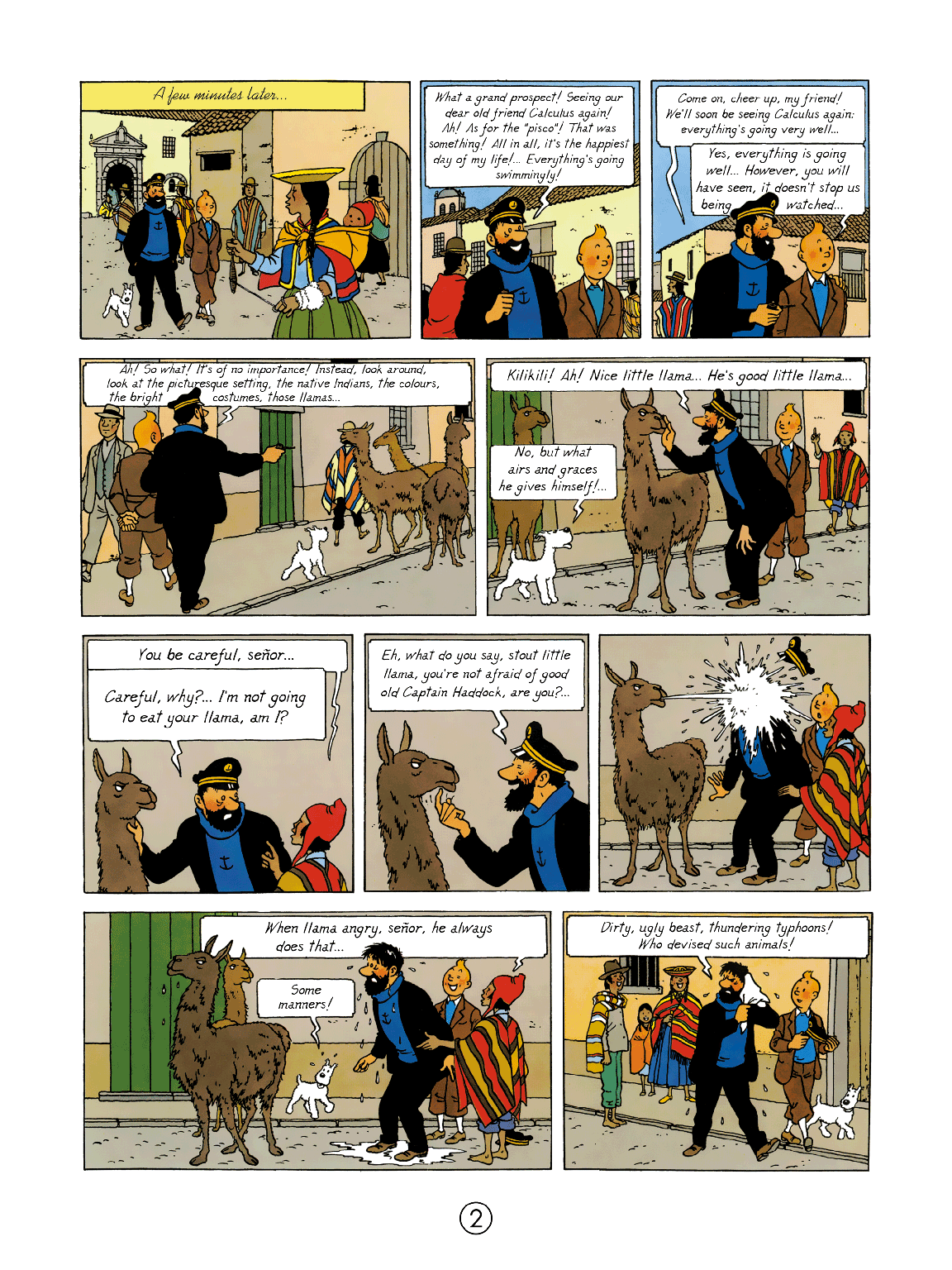 This adventure was the first story published in TINTIN magazine when it was launched on 26th September 1946, and heralded the opportunity for the continuation of an adventure which had been interrupted two years earlier. Tintin, Snowy and Captain Haddock fly to Peru in search of Professor Calculus, who has involuntarily committed sacrilege, and has been condemned to suffer the ultimate punishment.